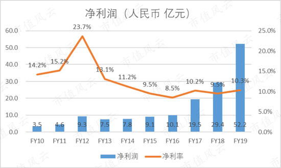 2019年净利润为52.2亿元,同比增长77.6%,净利率为10.3%,相比上一年提高了0.8个百分点,再次回到双位数水平。