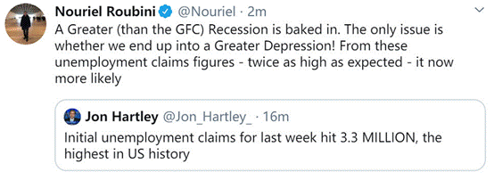 在数据公布之后,素有末日博士之称的鲁比尼在社交媒体发文称,这失业数据已经超过了金融危机,现在的问题是会不会比大萧条更惨。