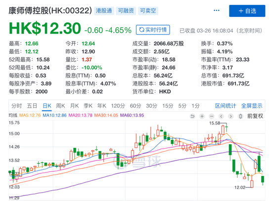 早前公布去年利润增速高于预期的康师傅控股(0322.HK)同样遭遇资金抛售,3月25日-26日累计大跌逾9%,收报12.3港元/股,两日蒸发68.61亿港元市值。