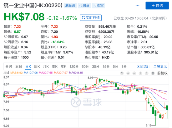3月26日,刚刚公布业绩的统一企业中国(0220.HK)遭遇大跌,盘中最低跌超6%,午后有所反弹,截至收盘报7.08港元/股,跌幅缩至1.67%,最新总市值305.81亿港元。