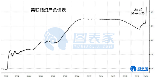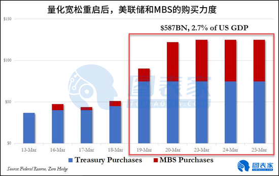在过去的一周里,从3月19日到3月25日,美联储购买了5870亿美元的债券,约占美国GDP的2.7%。