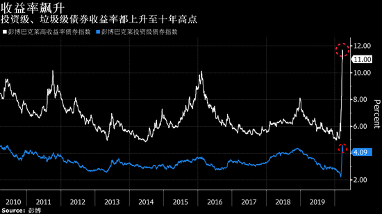 根据彭博汇总的数据,上述两大评级公司第一季度下调评级和上调评级数量之比超过3比1,是自金融危机最严重时期以来的最大季度数字。与此同时,投资级债券的风险溢价大幅上涨,而垃圾级债券的收益率八年来首次突破10%。