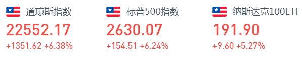美股周四高开高走,道指再次站上22000点。截至收盘,道指涨1351.62点,报22552.17点,涨幅为6.38%;纳指涨413.24点,报7797.54点,涨幅为5.6%;标普500指数涨154.51点,报2630.07点,涨幅为6.24%。