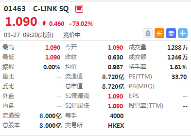 华盛资讯3月27日讯,马来西亚第二大文件外包服务商C-LINK SQ首日挂牌高开73.02%,开盘报价1.09港元,大幅超越此前暗盘涨幅,暗盘阶段该股收涨42.86%,不计手续费一手可赚1080港元。截止3月27日09:25,该股最新成交额1246万,总市值8.7亿港元。