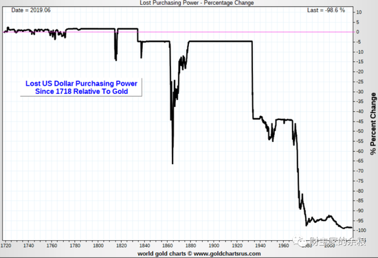 下面这张图,就是当今世界最核心的信用货币——美元,在过去300年来相对于黄金购买力的降低情况。