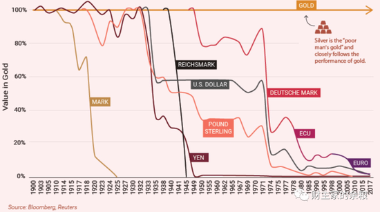 下面的这张图,就是用黄金来衡量120年来世界最主要经济体货币价值的变动情况,包括了金马克、日元、英镑、帝国马克、德国马克、欧元等,只要拉长到50年以上的期限,几乎所有纸币,其价值相比于最初都无限接近于0。