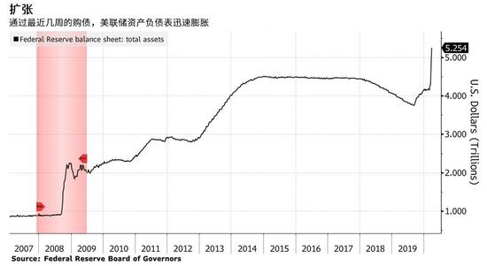 为了应对新冠病毒大流行,美联储也采取了史无前例的做法,大举购债并全力提供贷款。本周美联储资产负债表首次飙升至逾5万亿美元,一周内暴增逾5000亿美元,这大约是2008年10月金融危机中第二大规模的单周扩张速度的两倍。