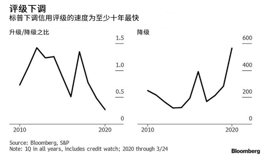彭博汇总的数据显示,上述两大评级公司第一季度下调评级和上调评级数量之比超过3比1,是自金融危机最严重时期以来的最大季度数字。