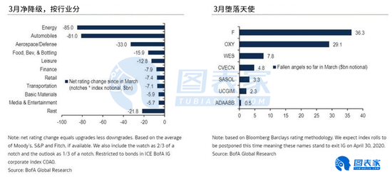 据美国银行计算,3月迄今净降级(降级减升级)公司债券总额为2840亿美元,其中最主要的是能源行业(850亿美元,占总数的30%),其次分别是汽车行业(810亿美元)和航空航天/国防工业(330亿美元)。