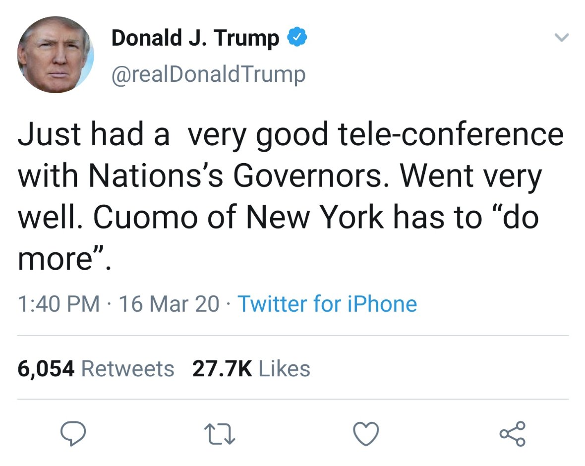 当地时间3月16日,特朗普发了一条推特,并如是写道:“刚刚与全国的州长们举行了电视电话会议,会开得非常好。但是,纽约州的科莫州长需要做‘更多的事情’。”