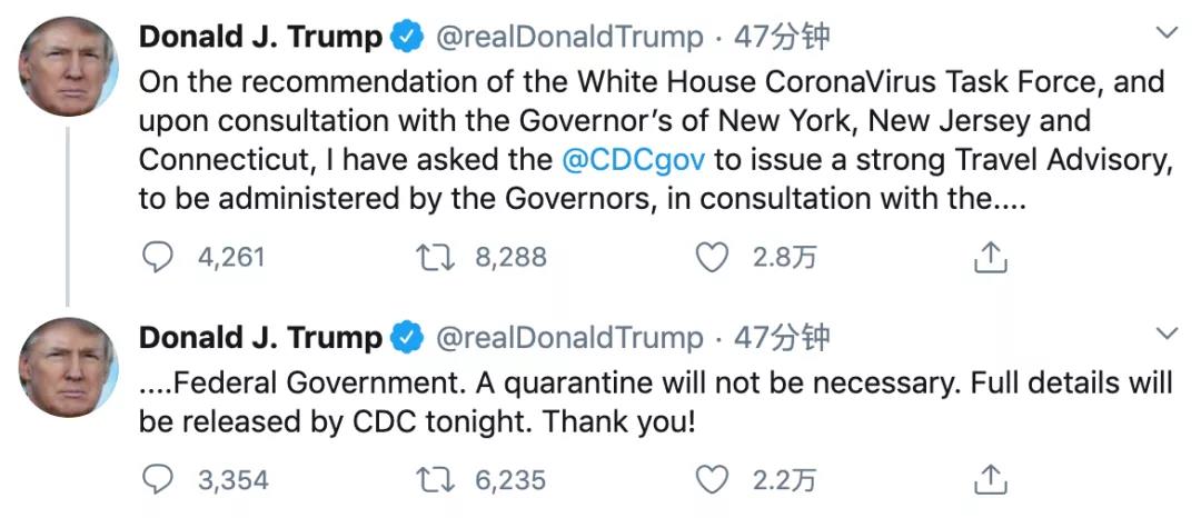 当日晚,特朗普通过社交媒体宣布其“强制令取消”,表示没必要对该三州实施强制隔离:根据白宫新型冠状病毒工作组的建议,并在与纽约州、新泽西州和康涅狄格州州长进行协商后,已要求CDC发布一份强有力的旅行警告,由州长与联邦政府协商后进行管理。
