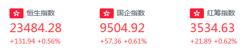 恒生指数开盘涨1.78%,全天高开低走,尾盘涨幅稍有扩大。截至收盘,恒生指数涨131.94点或0.56%,报23484.28点,全日成交额达1224.18亿。国企指数涨0.61%,报9504.92点,红筹指数涨0.62%,报3534.63点。