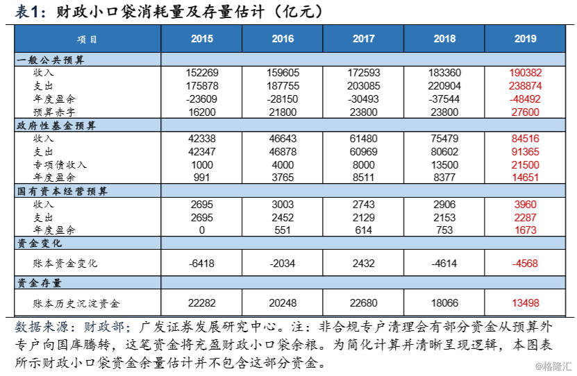 2019年财政小口袋余量规模进一步收缩。我们曾经估算2018年底(亦为2019年初)预算内财政小口袋余量尚存2.4万亿(其中1.8万亿来自预算内结存资金,6000亿元来自非规范专户整顿转入国库资金)。2019年财政减税降费力度空前,减税降费达2.3万亿,较2018年的1.3万亿显著增扩1万亿幅度,而2017年减税降费规模仅1万亿,与2018年相差不多。2019年账本一消耗2万亿左右财结余存量,账本二和账本三以富余资金补充大致1.5万亿结余存量,2019年底(亦为2020年初)预算内财政小口袋余量不足1.4万亿(不考虑非规范专户整顿部分),较前期进一步收缩。