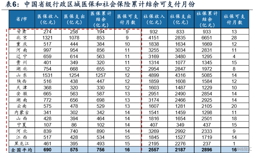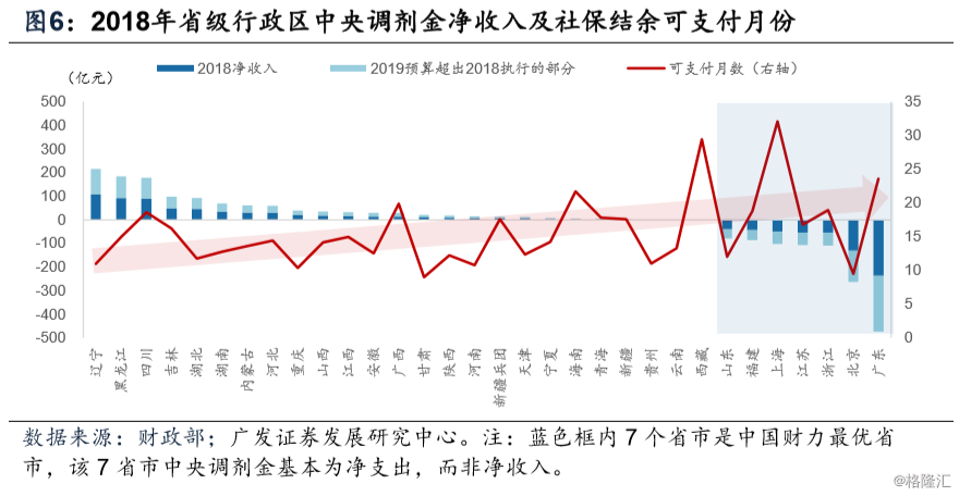 (二)加大中央调剂力度平衡地区财政压力2020年社保收支压力地区差异特征显性化。近年来地区社保收支压力持续分化。黑龙江“穿底”的社保结余资金(即累计结余资金小于零),指向财力较为薄弱地区难以依靠自身保费收入来覆盖保费支出。2月《关于阶段性减征职工基本医疗保险费的指导意见》指出,统筹基金累计结存可支付月份大于6个月的地区着力减、免、缓缴职工基本医疗保险费。按2018年数据,全国几乎所有省级行政区的医保结余均可支付6个月以上,本次职工基本医疗保险减、免、缓政策执行,几乎覆盖所有省级行政区。其他养老、工伤等基本保险缴费亦有不同程度减、免、缓。综上,因今年减费措施,本就分化的地区社保或体现出更为明显的地区差异。