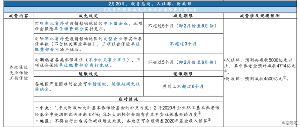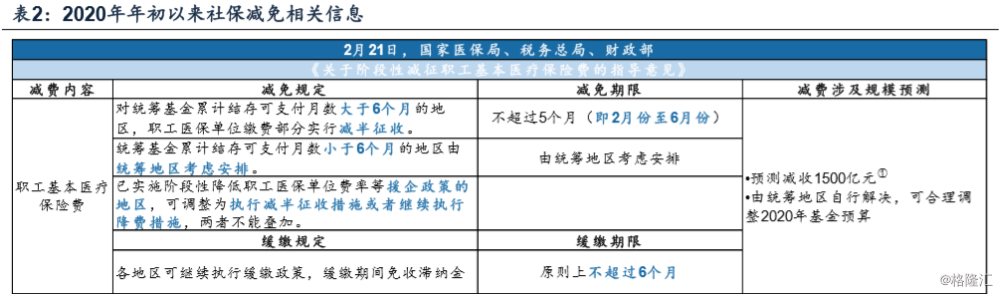 2月国家医保局、人社部等部门发文,减征(或缓缴)特定条件下的职工基本医疗保险费、基本养老、失业和工伤保险费用,公积金方面也做出类似灵活调整。按已知政策规范,我们粗糙估算2020年上半年社保收支缺口走阔6000亿元 ~1.5 万亿元。