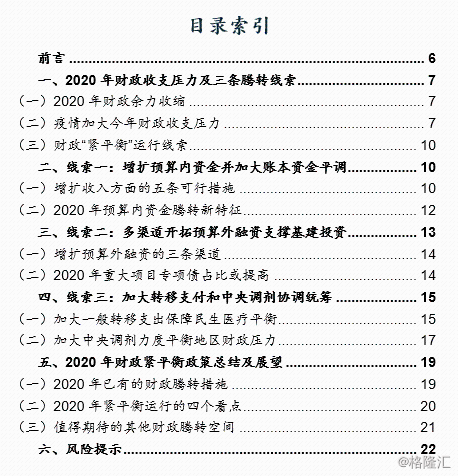 求解2020年紧平衡财政运行应对财政收支压力增扩之策,关键在于理解财政紧平衡的三条线索如何落实推进,这也是本文的核心分析思路。以财政紧平衡运行的三条线索为切入点,我们回溯目前已有财政腾转措施,归纳今年财政腾转的重点和看点,并进一步展望未来还有哪些财政腾转措施值得期待。