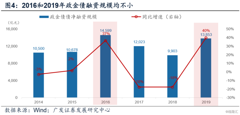 其一,增扩传统债权融资。具体有三点针对性操作:1)打开银行合意信贷规模,尤其放开企业中长期贷款规模约束。2)政策性银行扩表,在特定领域响应基建补短板的政策导向。具体操作上可通过PSL等特定流动性注入,或是增发政策性金融债,降低政策性银行负债成本,驱动政策性银行在资产端投向基建短板中长期贷款。数据上亦有印证:2016年为基建投资大年,政金债净融资量迅速扩张,2019年基建修复并对应企业中长期贷款回升,政金债融资规模也有相当幅度反弹。3)调适债券发行条件推动城投平台债券发行规模扩张。