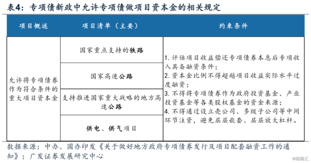 (二)2020年重大项目专项债占比或提高。基建项目满足“重大项目”属性等条件之后,地方政府专项债可用于基建项目资本金。因此,未来基建项目扩大资本金补充还可能体现为两点,专项债中的重大项目占比提高,且专项债融资作为基建项目资本金,杠杆效用或可提高。