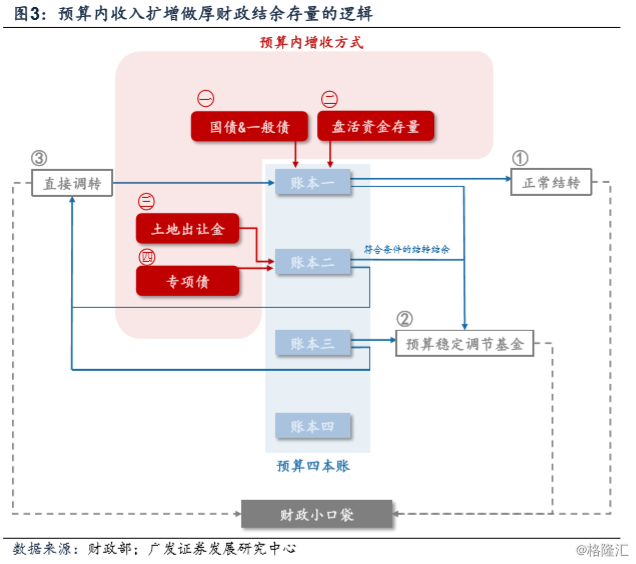 线索一:增扩预算内资金(即狭义财政收入),并结合财政小口袋等资金调转机制抹平局部账本常规收支缺口。