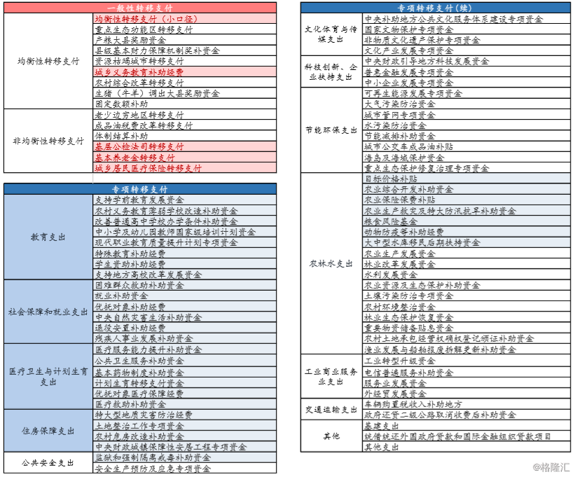 转移支付中“三保”支出关系财力薄弱地区必要财政开支能否得到保障。按资金用途是否对接特定项目投向,转移支付分为一般转移支付和专项转移支付。一般转移支付旨在填补下级政府财力缺口,专项转移支付承担特定经济和社会发展目标,并有专门资金用途安排。一般转移支付中与三保支出(保工资、保运转和基本民生相关)相关性较高的分项主要有“基本养老金转移支付”、“城乡居民医疗保险转移支付”、“基层公检法司转移支付”、“均衡转移支付(小口径)”与“城乡义务教育补助经费”。专项转移支付中与医疗卫生密切相关的主要有“教育支出”、“社会保障和就业支出”、“医疗卫生与计划生育支出”等。