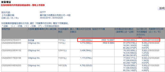 新浪港股讯 3月30日消息,根据联交所最新权益披露资料显示,2020年3月27日,富力地产(02777.HK)获执行董事兼董事长李思廉在场内以每股均价10.0667港元增持100万股H股,涉资1006.67万港元。增持后,李思廉最新H股持股数目为3900万股,持H股比例由2.95%升至3.03%。