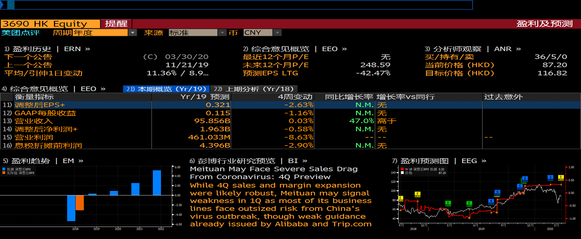 美团点评将在3月30日(周一)公布2019年Q4财报。根据彭博分析师预期,2019年美团点评营收为958.6亿元,同比增长47%;调整后净利润为19.63亿元,调整后每股收益为0.321元。