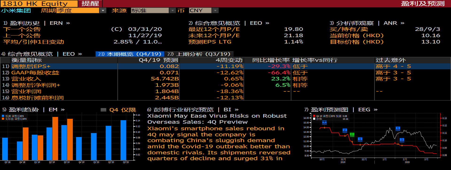 小米集团将于3月31日(周二)发布2019年第四季度财报。根据彭博分析师预期,小米集团2019年Q4有望实现营收547.4亿元,调整后净利润为19.73亿元,同比下降9%;调整后每股收益0.08元。