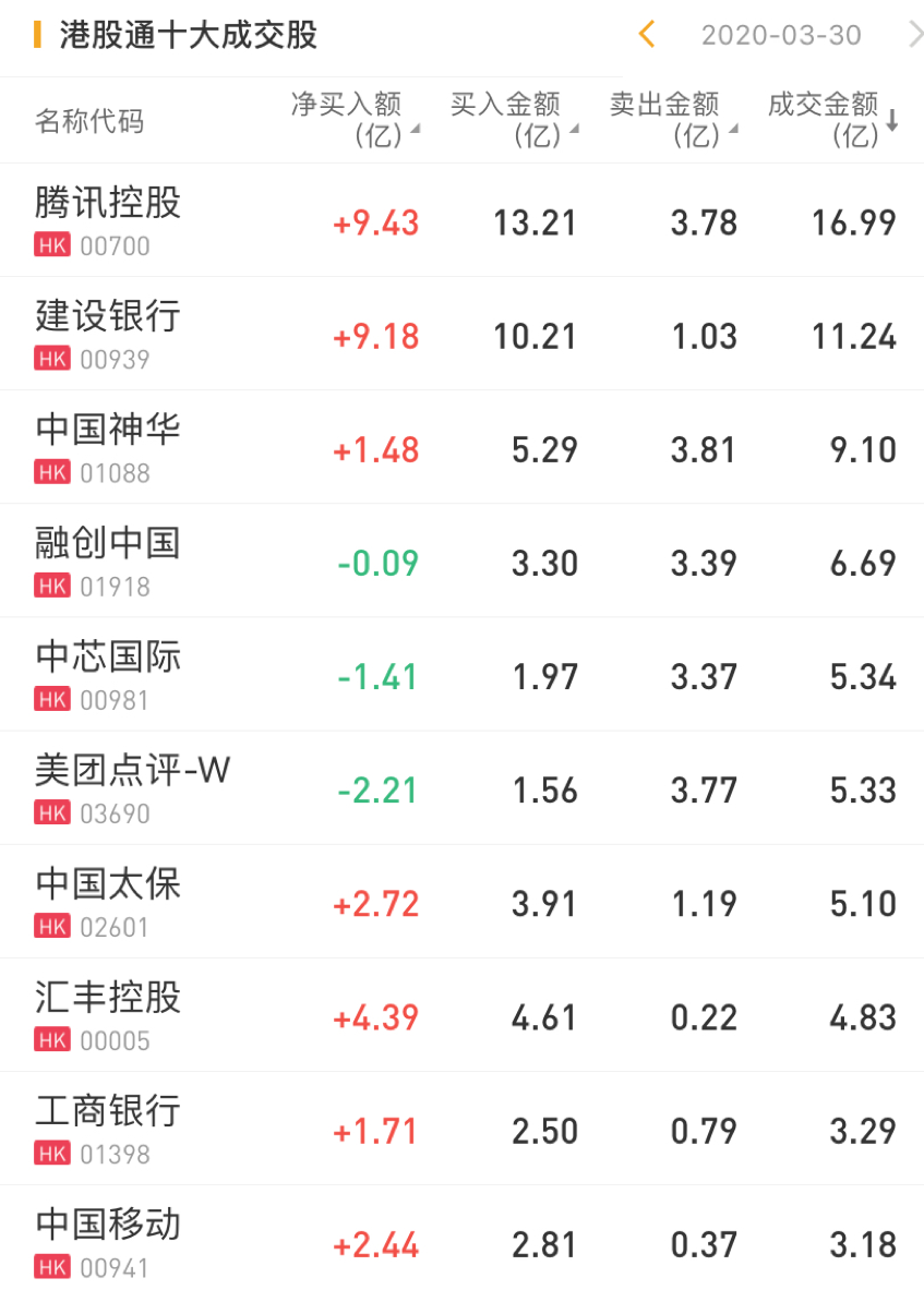 今日净买入腾讯控股9.43亿港元,净买入建设银行9.18亿港元,净买入中国神华1.48亿港元,净买入中国太保2.72亿港元。