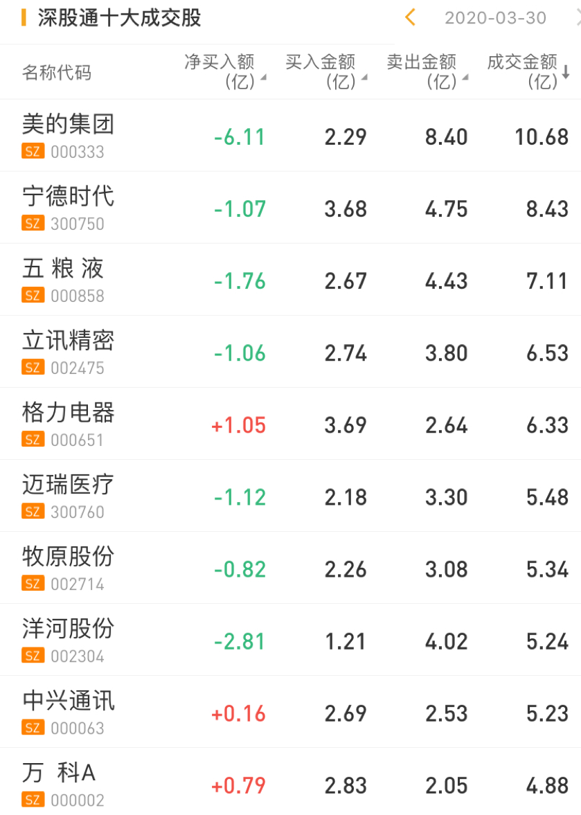 深股通净卖出美的集团6.11亿元,净卖出宁德时代1.07亿元,净卖出五粮液1.76亿元。