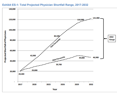 美国医学院协会(AAMC)2018年的一份报告也警示:美国医生短缺的情况正在继续恶化。AAMC预估,到2030年,医生短缺数量可能会达到12.13万,而2017年同期估计数为10.5万;基层医疗人员短缺数量预计在1.48万至4.9万之间。