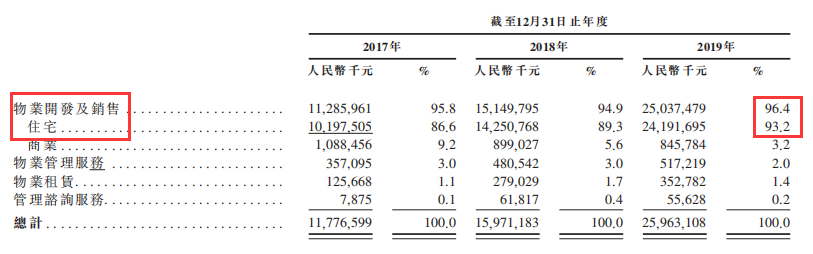 招股书显示,2019年其收入近260亿元,近三年年复合增长率达48.5%,其中房地产销售是核心贡献点,最新占比96.4%。