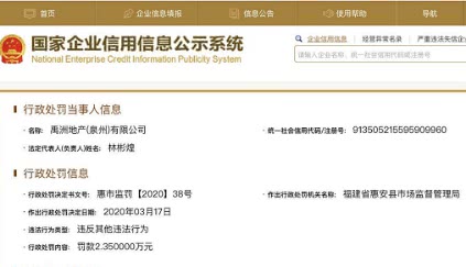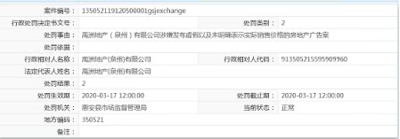 中国经济网北京3月31日讯 (记者 张海蛟) 近日,国家企业信用信息公示系统公示行政处罚决定书显示,福建省泉州市惠安县市场监督管理局对禹洲地产(泉州)有限公司(以下简称“禹洲地产泉州”)罚款2.35万元。记者查询发现,该处罚事由为禹洲地产泉州涉嫌发布虚假以及未明确表示实际销售价格的房地产广告案。