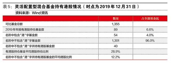 在“灵活配置型混合基金”分类下,基金在有了相对于股票型和偏股型基金更多的调仓空间时,对香港市场的参与度就变得相对更小。在2019年12月31日的时点上,“灵活配置型混合基金”分类下共有1355只可比基金,其中有港股持仓的只有89只,占比6.6%,平均港股仓位28.9%。