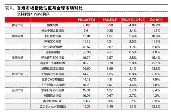 仅有个别几个市场的单项指标,比如英国市场的股息率、韩国市场的市净率等,比香港市场略低。而从PE和PB估值推算出的隐含ROE上,香港市场指数的水平在10%到11%附近,显著高于欧洲市场和大部分亚洲市场,与内地市场持平,仅显著低于美国市场。