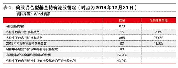 在“偏股型混合基金”基金中,情况也差不多。在2019年12月31日可比的873只基金中,只有101只持有港股,占比11.6%,平均持有24.9%的港股。在把名字中含有“港”字的18只基金剔除后,只有83只基金持有港股,占该类别855个基金的9.7%,平均仅持有13.9%的香港市场股票。