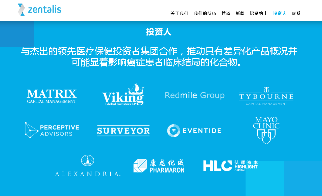 2015年9月,公司完成1500万美元A轮融资。2017年12月,公司完成3400万美元B轮融资。2019年12月9日,Zentalis宣布完成8480万美元的融资C系列融资。自2014年12月成立以来,该公司已从私人融资中筹集了总计1.47亿美元的总资金。现有投资者包括弘晖资本和康龙化成。