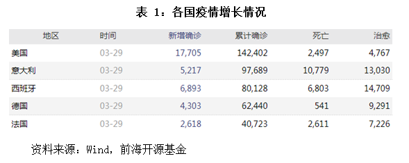 相比海外疫情爆发,我国疫情已控制较好。从2月13日后,我国累计确诊人数增速进入较慢阶段(二阶导变负),累计增速从之前的日均25.4%下降至日均0.6%,多省市多日新增确诊人数为0;可以看出,在2月下旬,疫情在我国已经有了较好的控制。但海外疫情迅速发展,截至3月29日,海外累计确诊人数超过60万人,从2月24日爆发至3月29日确诊人数日均增速达18%。