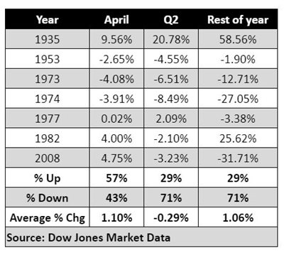 道指3月累跌近14%,为2008年10月以来的最差月度表现;标普500指数3月累跌逾12%,为2008年10月以来最差月度表现。这些指数在经历了与3月份一样糟糕的一个月后的平均表现如下所示: