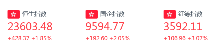 恒生指数开盘涨1.89%,全天呈探底回升走势,尾盘涨幅稍有扩大。截至收盘,恒生指数涨428.37点或1.85%,报23603.48点,全日成交额达1133.41亿。国企指数涨2.05%,报9594.77点,红筹指数涨3.07%,报3592.11点。