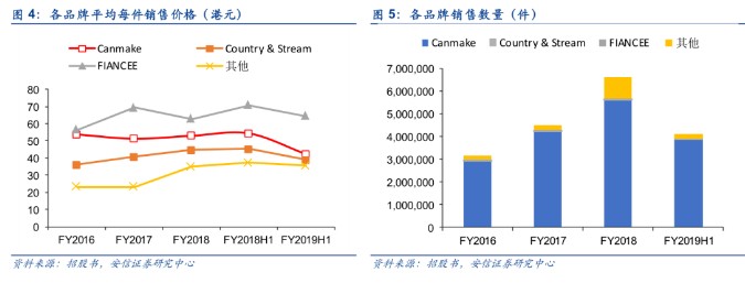公司销售的产品价格具备吸引力,介乎28港元至154港元之间。公司销售的化妆品平均价格皆在百元以下,价格具备吸引力。从销售价格走势来看,2016-2018财年公司各个品牌的销售价格呈现缓慢上升的状态,其中Country& Stream、FIANCEE趋势较为明显。但到了2019财年上半年(即2019年6月30日-12月31日),受到香港地区游行活动、游客减少等因素的消极影响,市场竞争更为激烈,为了刺激消费,销售价格有明显的回落。