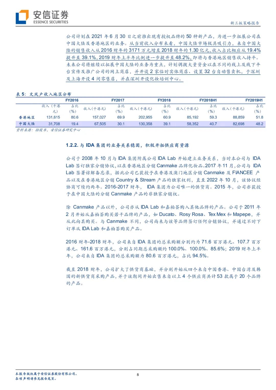 截至最新,公司为Mumchit香水产品及Country & Stream产品于香港、Oguma产品于香港及中国大陆、Canmake及FIANCEE产品于香港及澳门的独家分销商。此外,公司亦已获授Canmake产品于中国大陆的分销权。