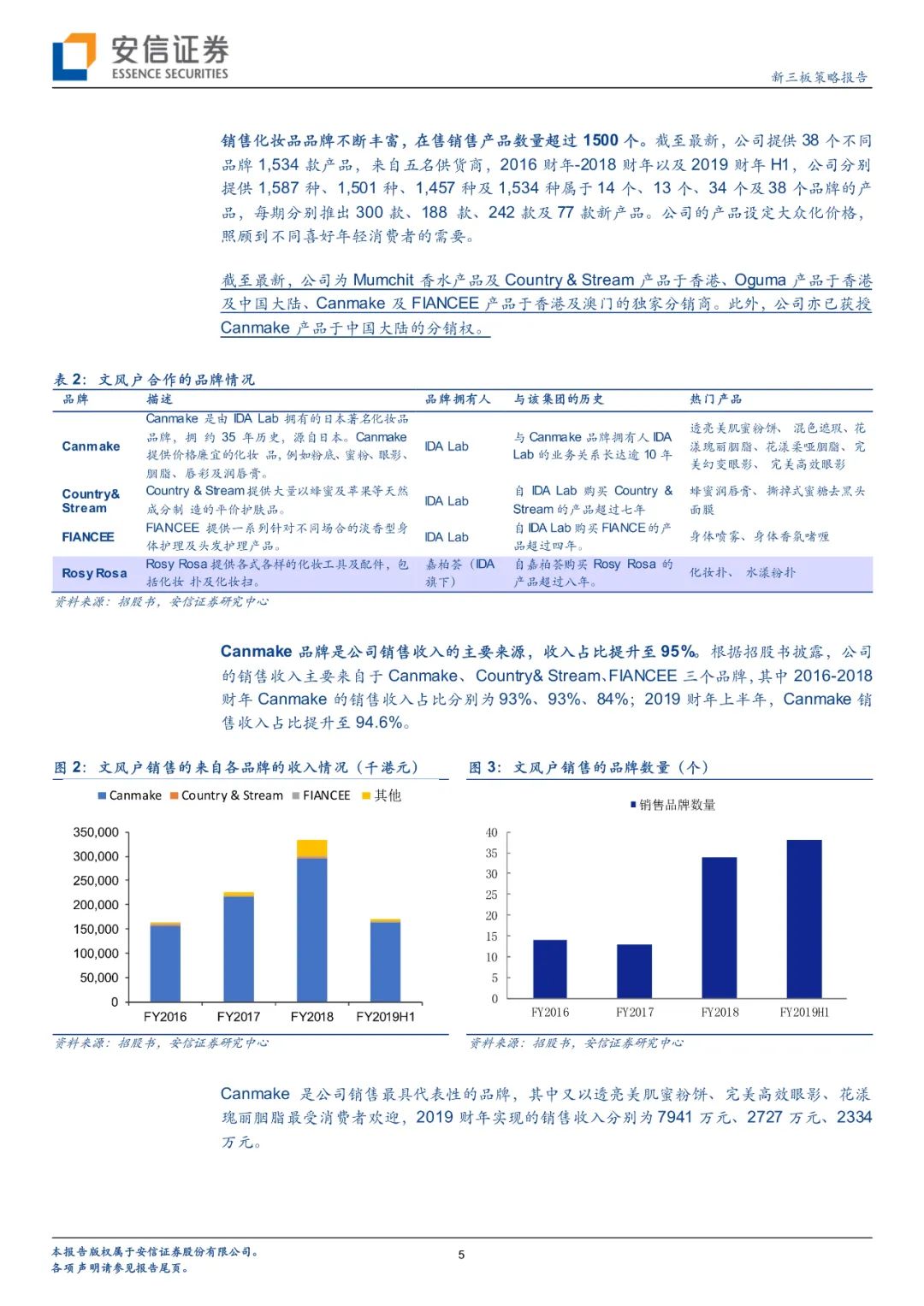 Canmake作为日本化妆品领导品牌,在亚洲拥有数百万名追捧者。该品牌于2017年获七项不同类别的Cosme美妆大赏(Cosme Best Cosmetics Awards),为日本美容行业首个于同年在日本最具影响力评级系统中获多项大奖的单一品牌。Canmake品牌是公司销售收入的主要来源:根据招股书披露,公司的销售收入主要来自于Canmake、 Country& Stream、FIANCEE三个品牌,其中2016-2018财年Canmake的销售收入占比分别为93%、93%、84%;2019财年上半年,Canmake销售收入占比提升至94.6%。公司为Mumchit香水产品及Country & Stream产品于香港、Oguma产品于香港及中国大陆、Canmake及FIANCEE产品于香港及澳门的独家分销商。此外,公司亦已获授Canmake产品于中国大陆的分销权。