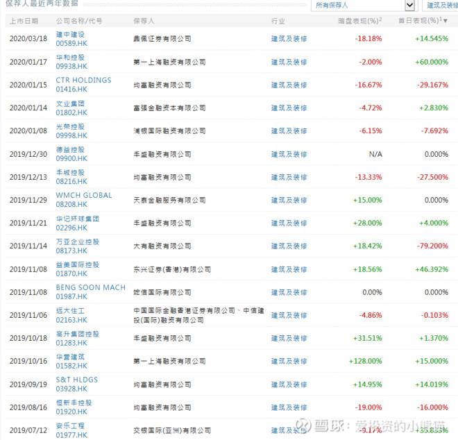 建筑行业来香港上市的是所有行业中公司最多的,最近半年上市的这些公司17个,首日上涨了10个下跌7个,其实基本上也是涨跌参半了,建筑行业的股票本来就多,所以这个指标基本上没有太多的参考性,涨和跌都是各50%概率。