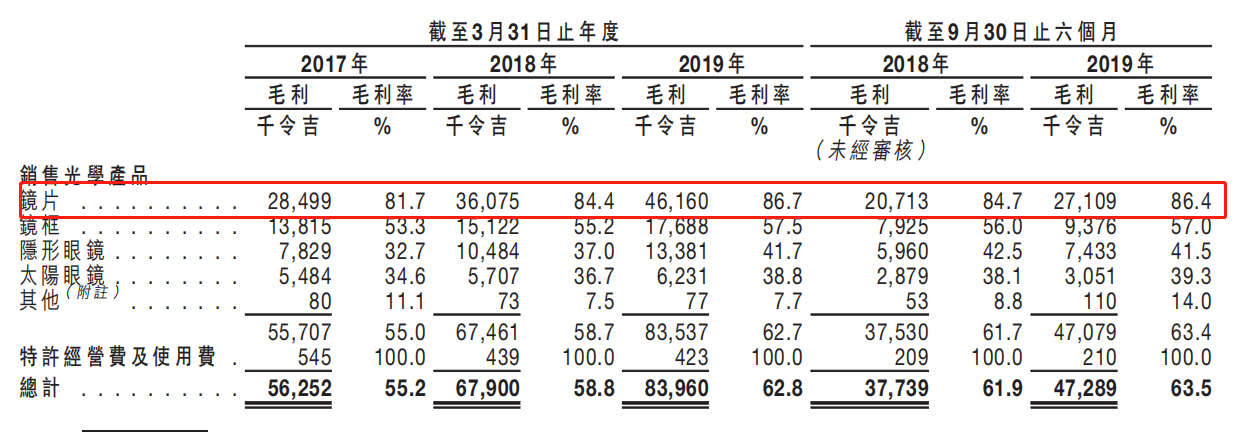 2019年一季度,MOG HOLDINGS的镜片产品毛利率水平高达86.7%,所有产品毛利率达到