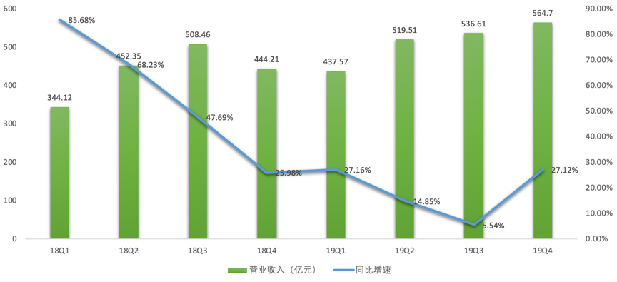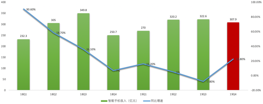 Q4小米实现营业收入564.7亿元,同比增长27.1%,环比增长5.2%,整体超越市场一致预期2.9%;2019年全年,小米实现总收入2058.3亿元,同比增长17.7%。整体来看,Q4营收重启增长轨道,但全年表现仍然承压。