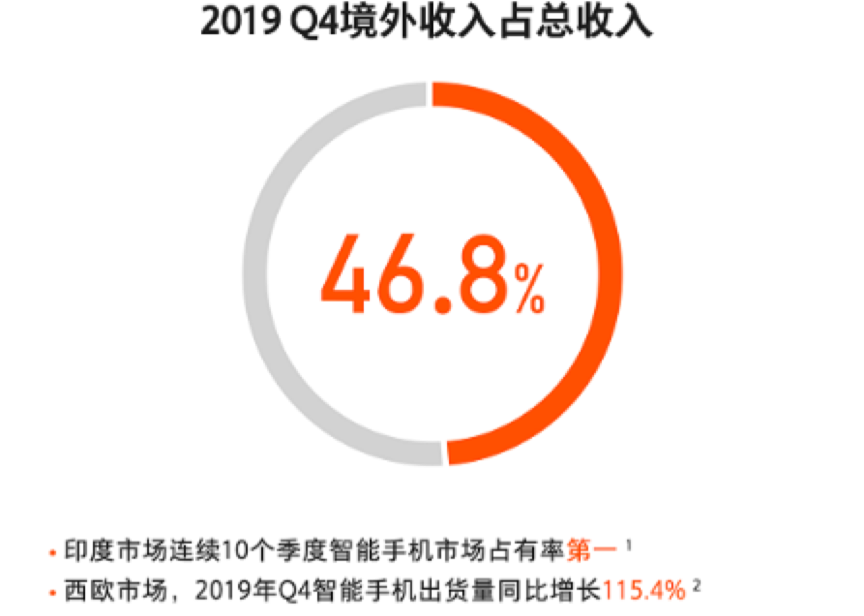 2019年全年,小米共实现境外收入912亿元,同比增长30.4%,目前占总收入比重达到44.3%。据IDC、Canalys数据显示,小米在印度智能手机市场占有率已经达到28.7%,连续10个季度排名第一;Q4,小米在西欧市场的智能手机出货量同比增长115.4%,海外市场进展迅速。