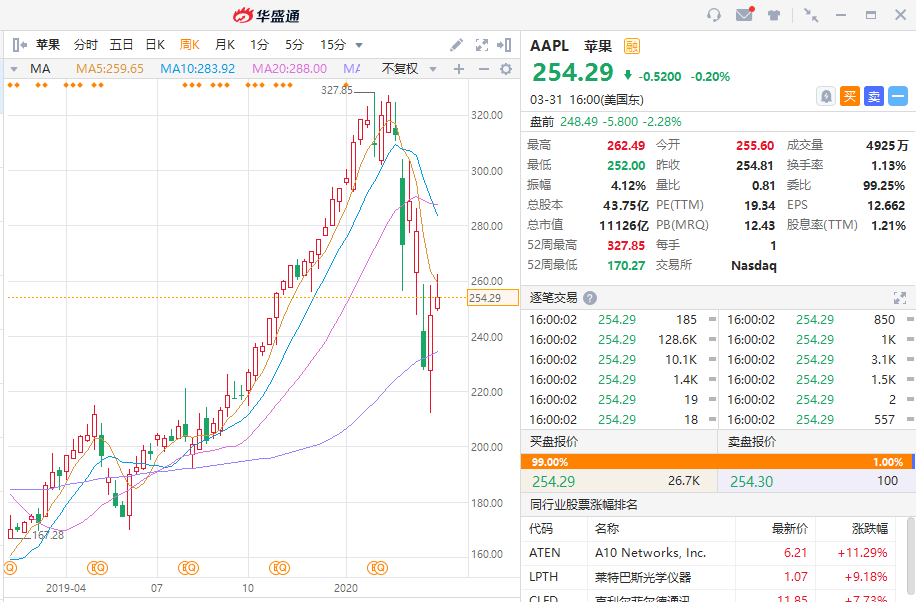 但是,随着市场开始从2008年金融危机以来最严重的抛售中恢复过来,苹果也录得了明显的反弹,从3月的最低点上涨了约20%。该股周二收盘下滑0.2%,至254.29美元。