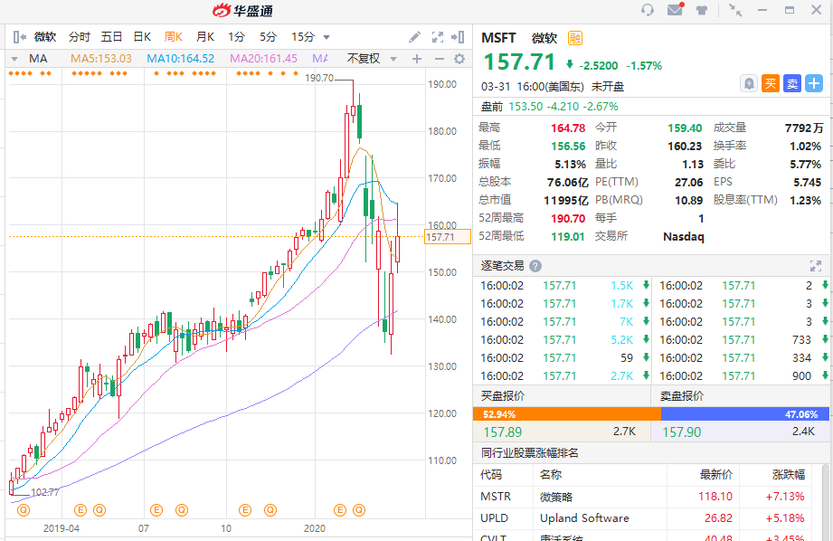 经历了过去一个月的动荡,微软的股价年内重新转涨。该股周二收于157.71美元,较3月23日的低位反弹了近15%。微软是去年表现最好的科技股之一,为投资者带来了60%的回报。