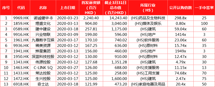 从3月份公司募资额来看,最高的是著名生物科技公司诺诚健华-B,首发募资总额22.4亿港元,截止3月底总市值达142.4亿港元。其次是国内综艺节目制作商煜盛文化,首发募资额达9.04亿港元。