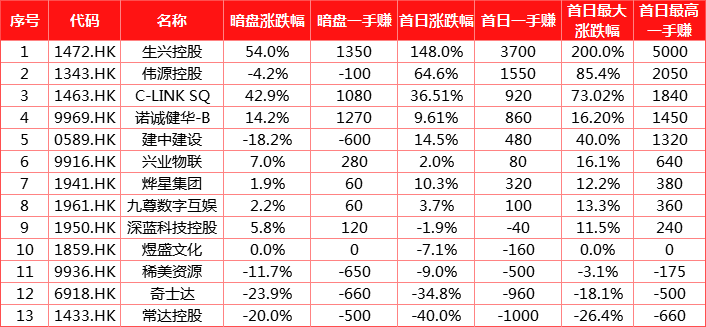 其中暗盘收市一手收益的前三名分别为生兴控股、诺诚健华-B以及C-LINK SQ,收益分别为1350港元、1270港元、1080港元。